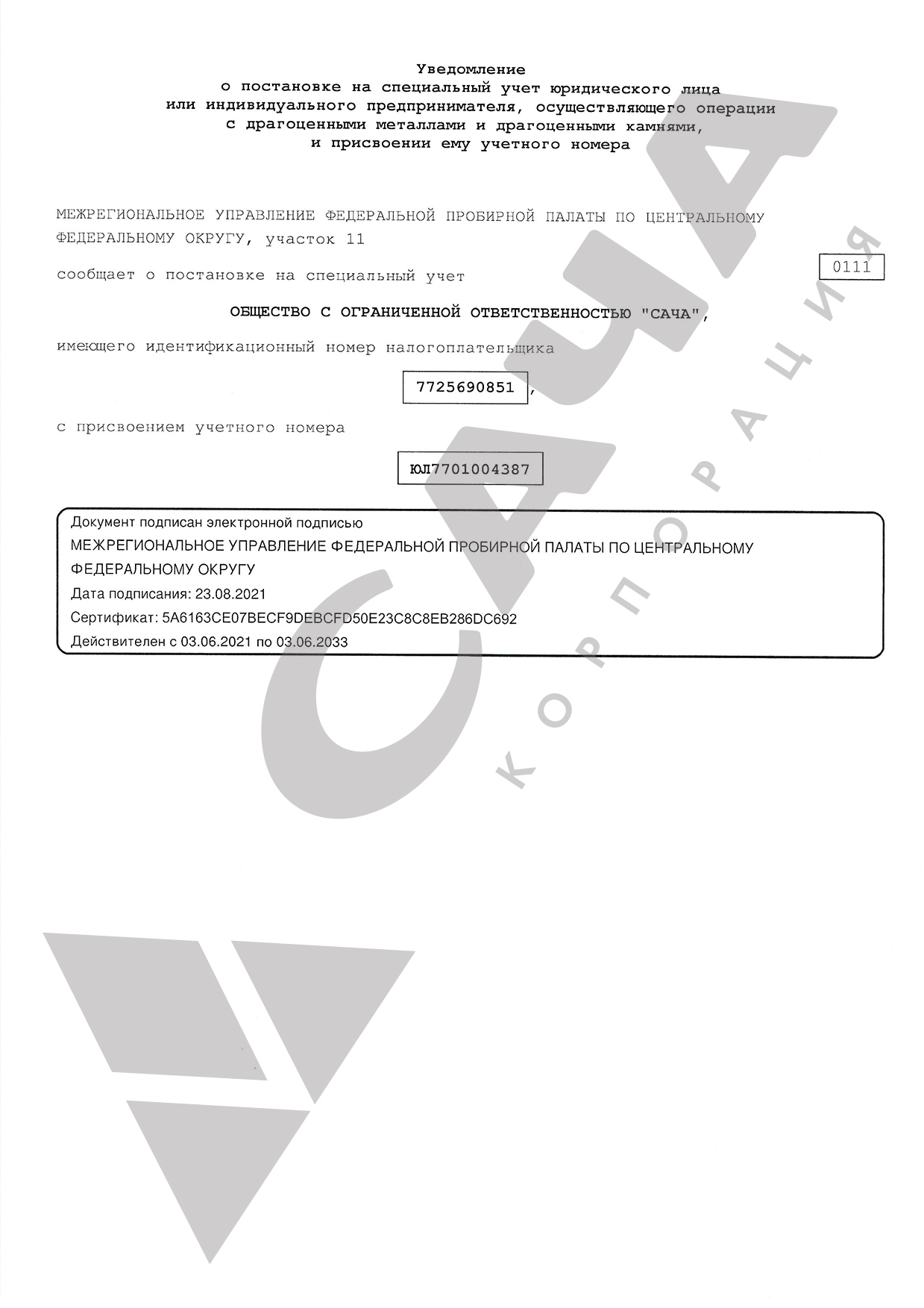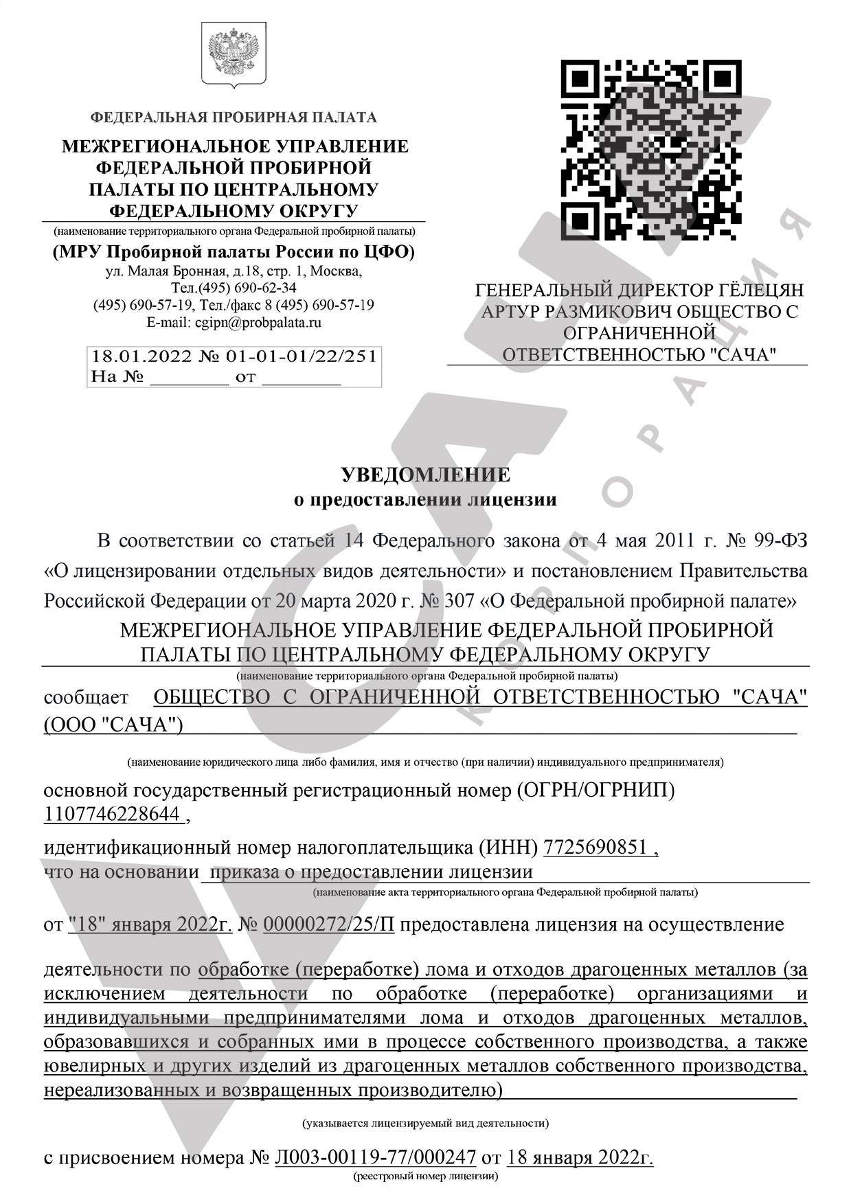 Наша компания состоит на специальном учёте в Пробирной палате РФ