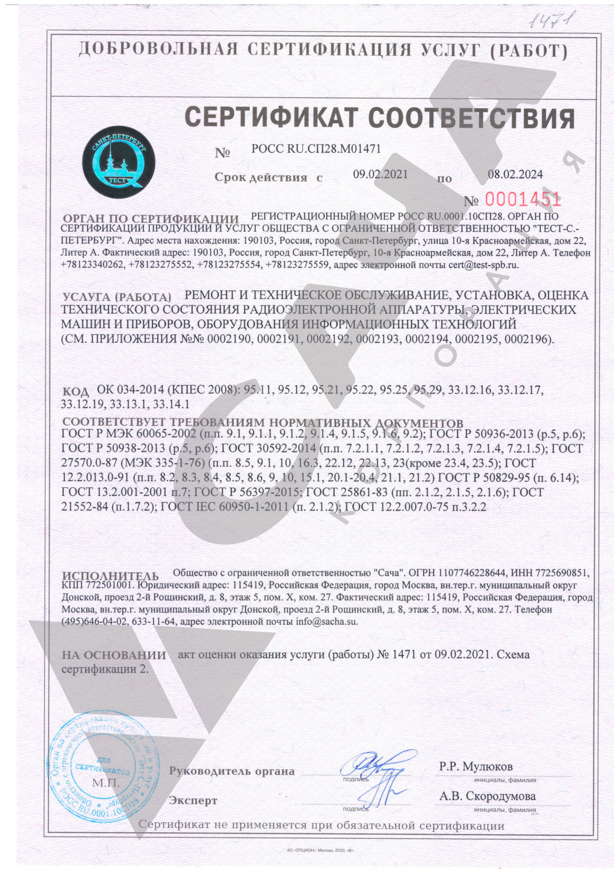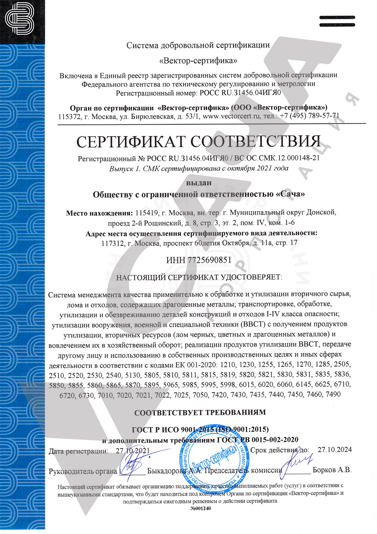 Сертификат соответствия системы менеджмента качества стандарту ГОСТ Р ИСО 9001-2015
